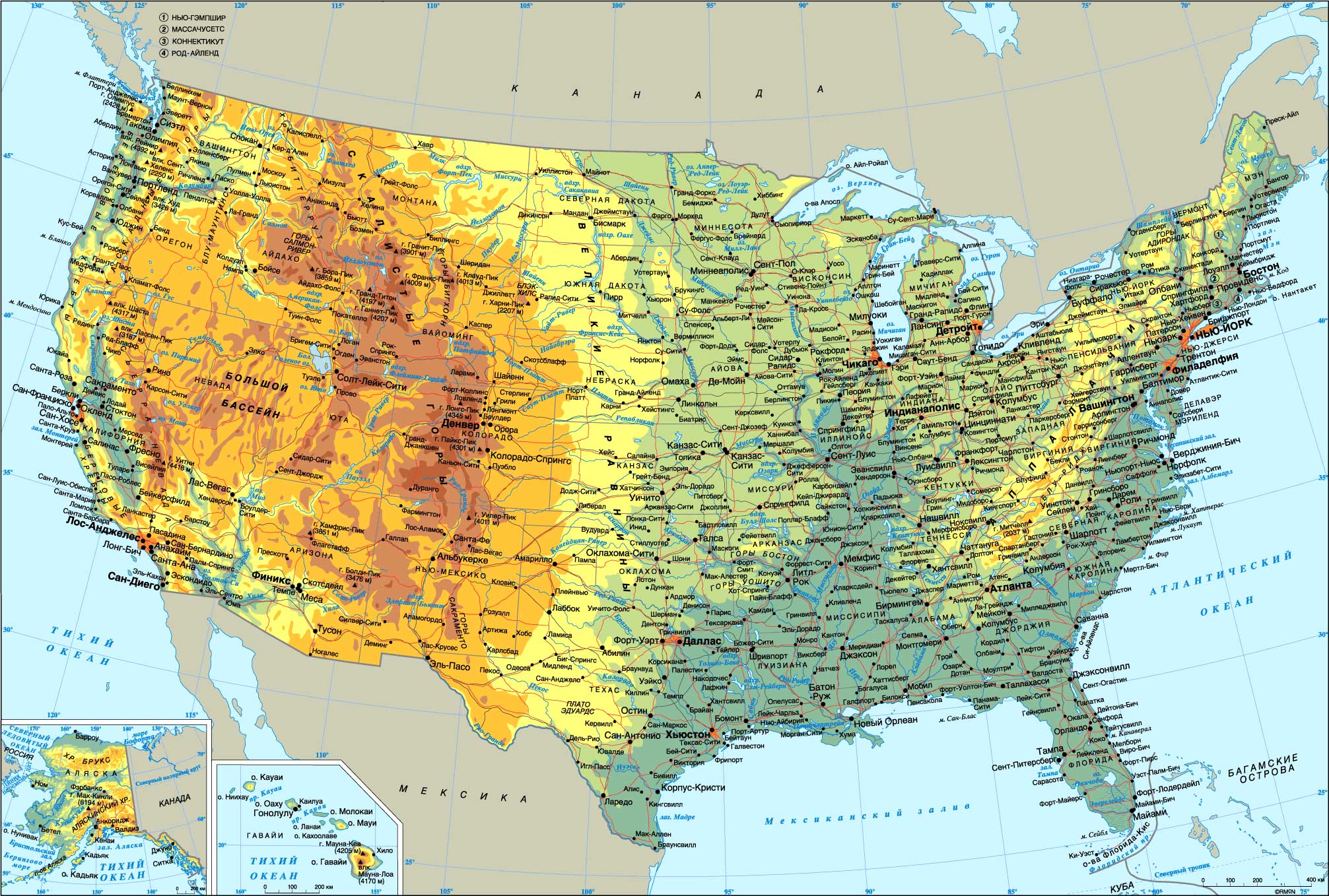 подробная карта США с обозначением крупных населенных пунктов, автомобильных дорог,